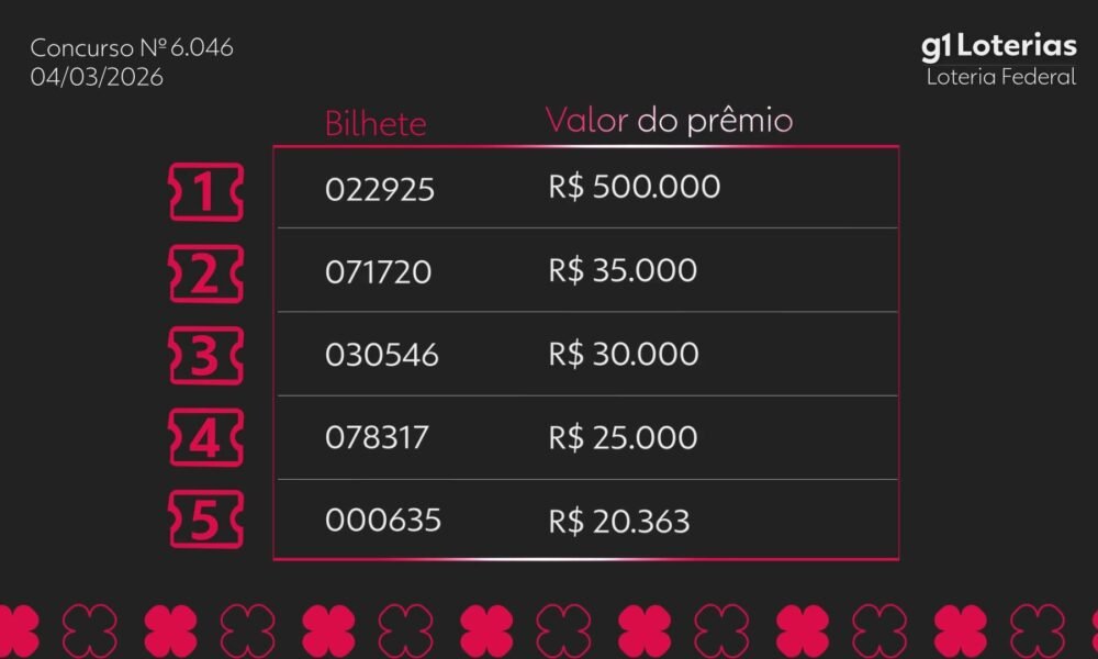 Sorteio realizado nesta quarta-feira premiou bilhetes com valores de até R$ 500 mil. O concurso 6046 da Loteria Federal teve seu resultado divulgado nesta quarta-feira (4)....