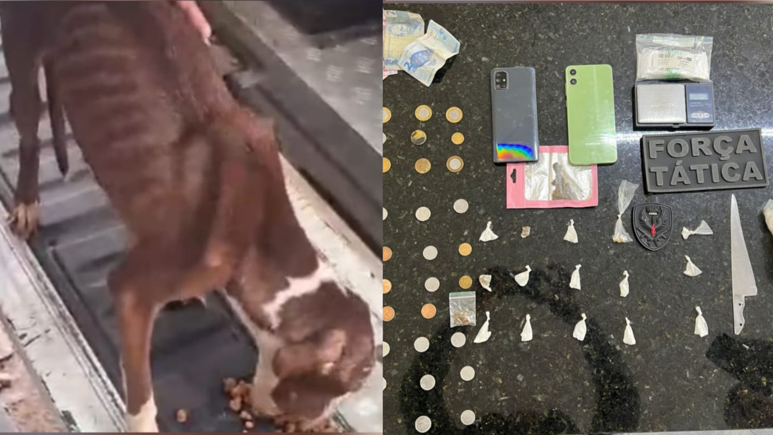 Além do resgate dos cães, a polícia apreendeu 12 porções de cocaína, duas de maconha, uma de crack, além de balança de precisão, faca, celulares e dinheiro fracionado. Todo o material e os envolvidos foram entregues às autoridades para as medidas legais.